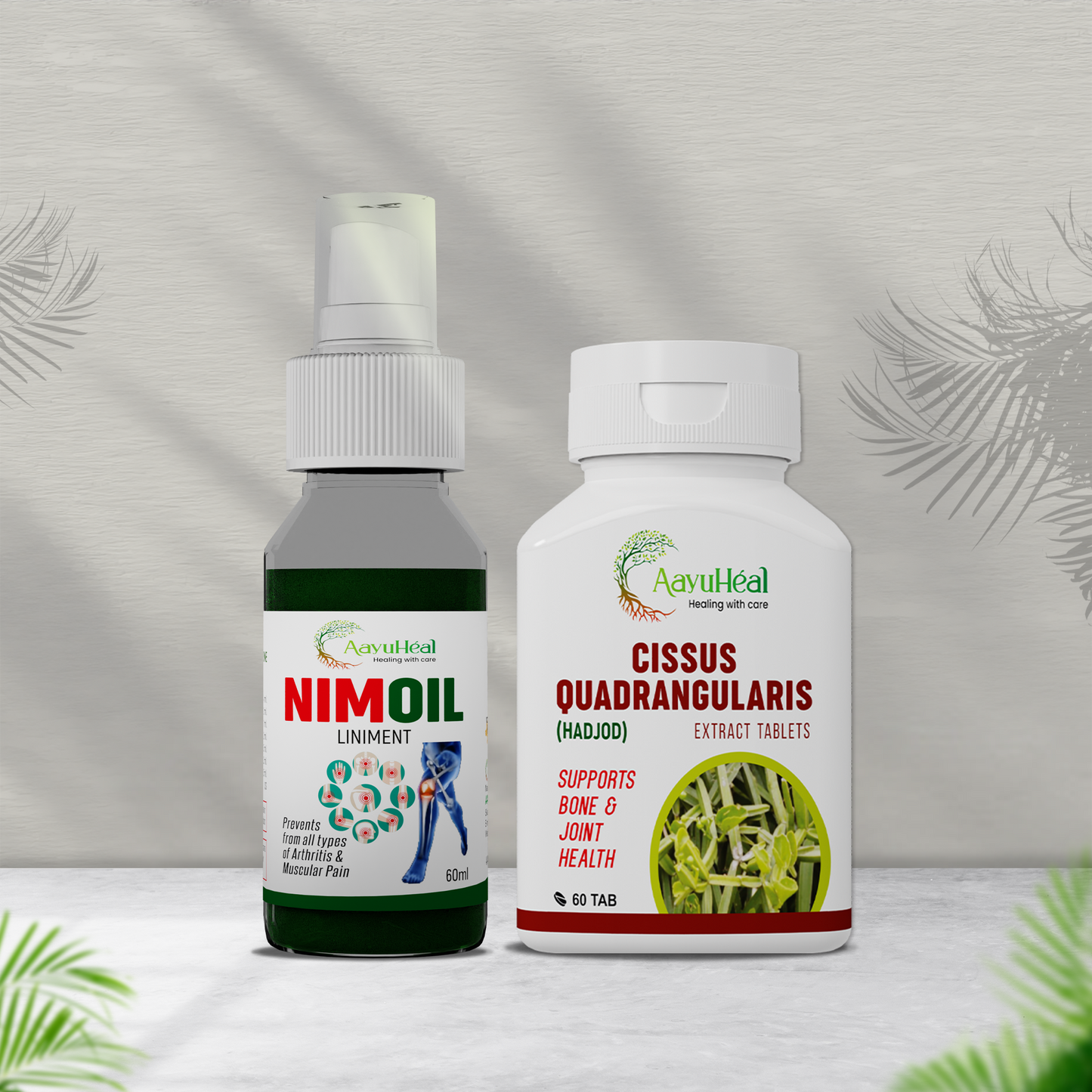 The AayuHeal Pain Relief Combo combines the nourishing power of NimOil Pain Relief Oil and Cissus Tablets to support joint comfort, muscle flexibility, and overall bone health.